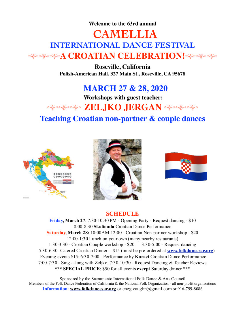 The 63rd annual Camellia International Dance Festival with folk dance workshops, dance parties, and performances!