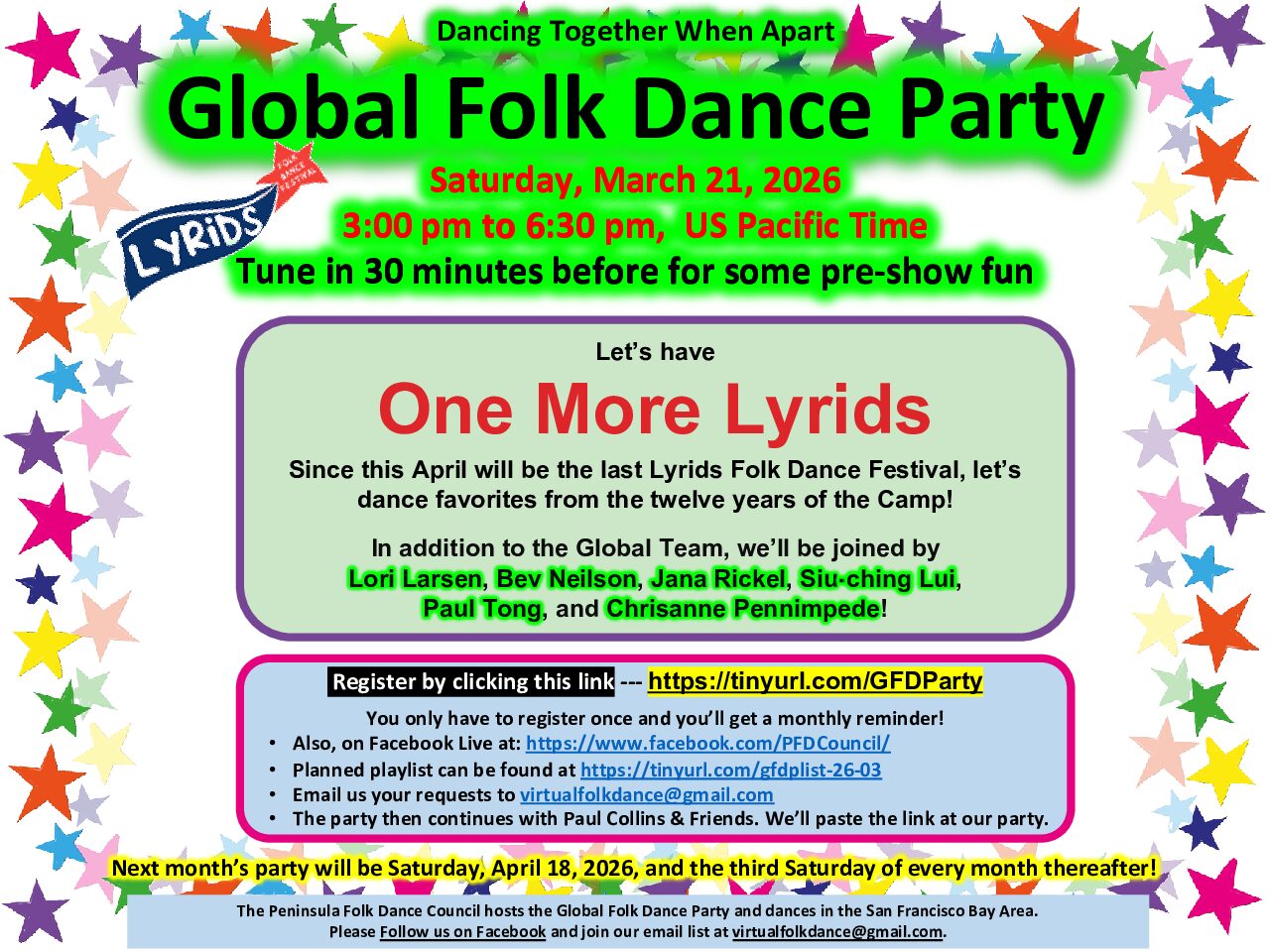 Since this April will be the last Lyrids Folk Dance Festival, let’s dance favorites from the twelve years of the Camp! In addition to the Global Team, we’ll be joined by Lori Larsen, Bev Neilson, Jana Rickel, Siu-ching Lui, Paul Tong, and Chrisanne Pennimpede!