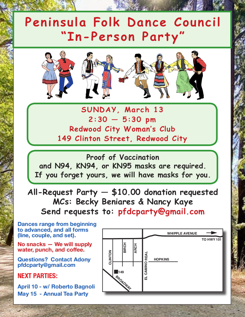 Join the Peninsula Council Folk Dancers for an all-request dance party! We’ve missed dancing with you!
