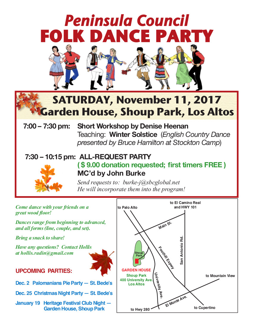 Denise will teach the English Country dance Winter Solstice, learned from Bruce Hamilton at Stockton this summer.