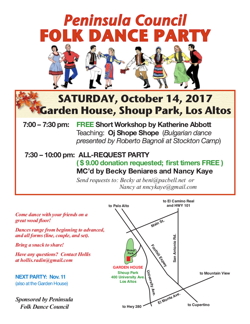 7:00-7:30pm — Katherine Abbott will teach Oy Shope Shope, a Bulgarian folk dance introduced by Roberto Bagnoli.
