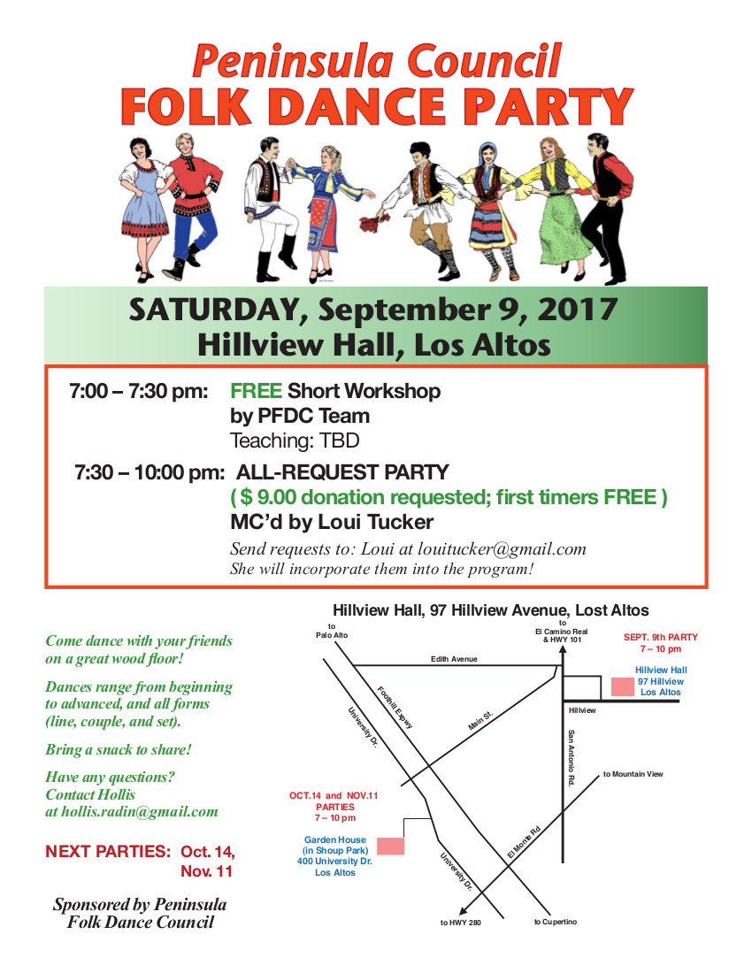 Federation members can add or update their upcoming dance events to the calendar by sending event details to events@folkdance.com