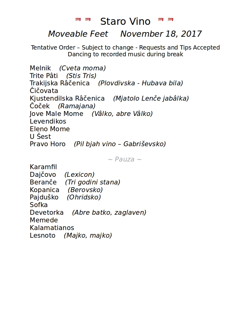 Live Balkan music for dancing with Staro Vino. Only the finest vintages! They play dance tunes and table songs from Bulgaria, Macedonia, Greece, Roma, and a sprinkling of our favorite international folk dances.