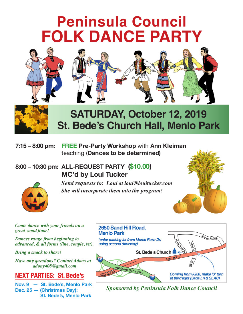 St. Bede's Church Hall 2650 Sand Hill Road, Menlo Park, CA, United States7:00pmDoors open 7:15-8:00pmFree short dance workshop with Ann Kleiman teaching some of her favorite new dances! 8:00-10:30pmALL-REQUEST PARTY with Loui Tucker as MC Dances range from beginning to advanced and all forms (line, couple, set). Bring a snack to share!
