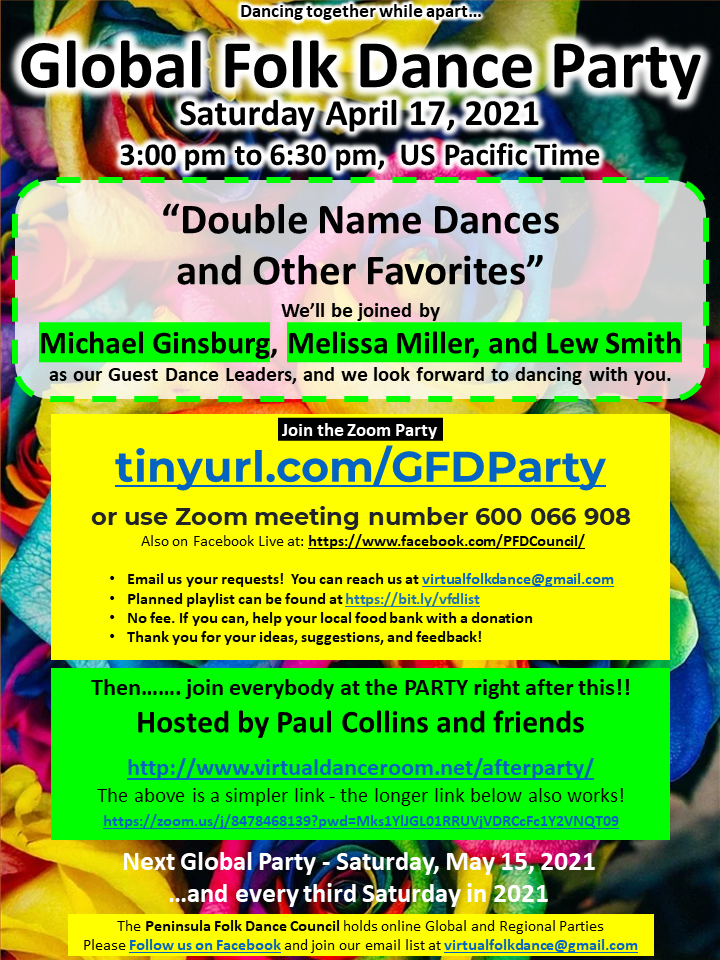Online CA, United StatesConnect Globally, Dance Locally. Follow folk dance leaders and dance watching enthusiasts worldwide. Join the Global Folk Dance Party team for a party named "Double Name Dances and Other Favorites." […]
